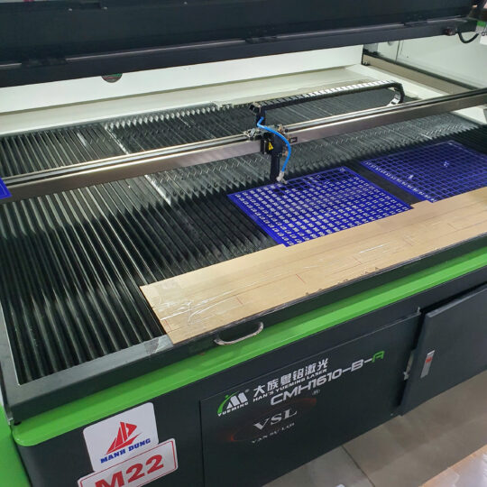 Sau khi in xong, mica được chuyển qua công đoạn cắt theo đường viền (outline).